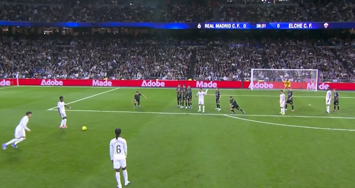 Гостите започнаха по-активно и в първите минути владееха повече топката. Реал пък през първия над половин час силно се затрудняваше да създава чисти положения и се отчете само с два неточни удара на Орелиан Чуамени и Антонио Рюдигер. Така се стигна до 39-ата минута, когато домакините успяха да излязат напред. Федерико Валверде стреля силно от пряк свободен удар, а вратарят на Елче Матиас Дитуро успя да избие. Последва разбъркване, а топката попадна точно на волето на Рюдигер, който не остави никакви шансове на стража на гостите - 1:0 за Реал Мадрид.